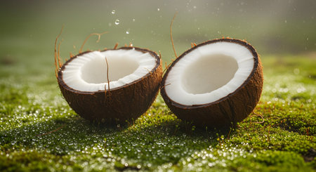 Two fresh coconut halves rest on a lush green mossy surface, surrounded by mist and water droplets. The natural lighting highlights the white coconut meat and the textured brown shell, creating a fresh and organic tropical atmosphere.