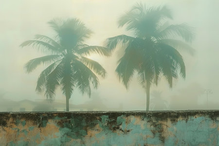 Coconut palm trees on a concrete wall in the fog.