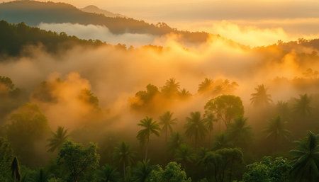 Experience the serene beauty of a misty tropical jungle from above. Lush palm trees emerge from ethereal morning fog, creating a tranquil, awe-inspiring natural landscape.