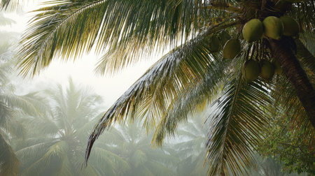 Coconut plantation in early morning mist with soft sunlight filtering through the trees