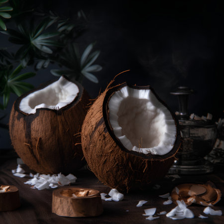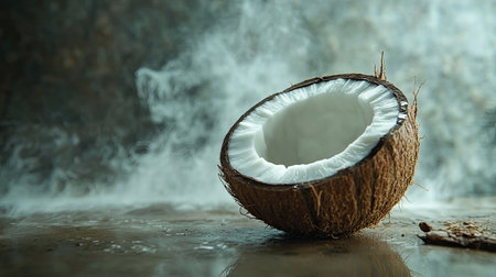 A beautifully arranged fresh coconut shell resting on a smooth surface with a soft smoky background, creating a tropical and organic ambiance perfect for culinary or health-related projects.