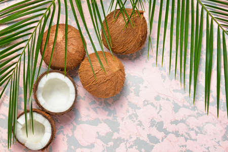 Broken coconuts on gray wooden background with palm leaf. White coconut pulp. High quality photo
