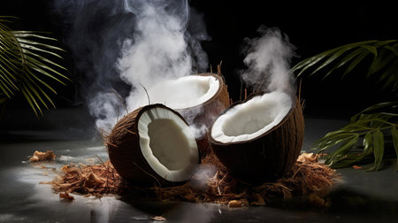 Two halved coconuts release aromatic smoke against a dark backdrop, creating a mystical atmosphere.