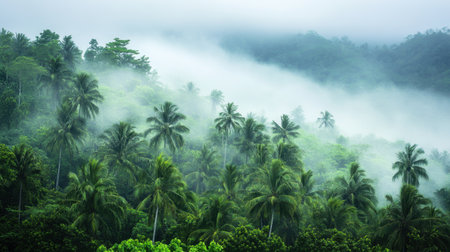 Experience the serene beauty of a lush tropical rainforest, shrouded in mist with towering palm trees and vibrant greenery, showcasing nature's tranquil ecosystem.