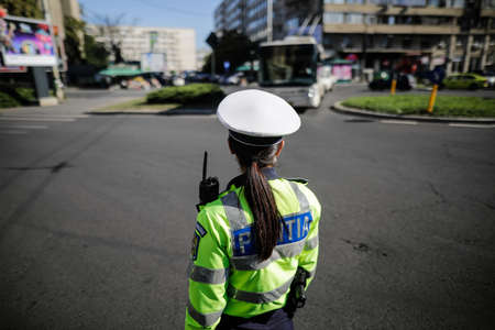 Bucharest, Romania - October 18, 2020: Female police officer pulls over cars in traffic to check if the drivers comply with the anti covid measures.