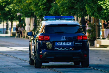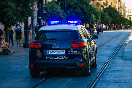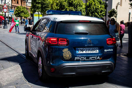 Seville Spain September 04, 2021 Police car patrolling in the streets of Seville, an emblematic city and the capital of the region of Andalusia, in the south of Spain