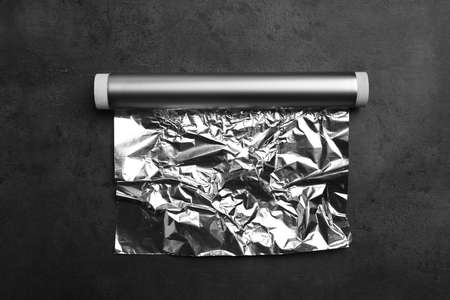 Roll of aluminum foil on dark gray table, top view