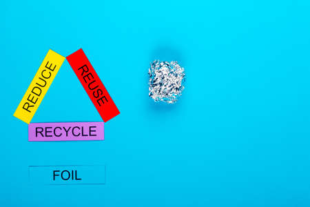 Recycle concept showing reduce, reuse & recycle with foil on a blue background