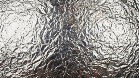 Close-up of crinkled silver foil with reflective sheen and sharp textures
