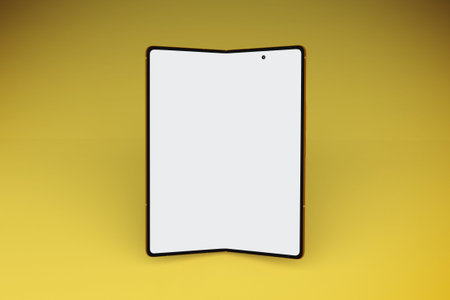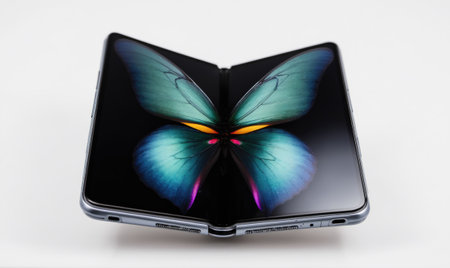 A foldable smartphone with a butterfly on the screen, open and laying on a white surface