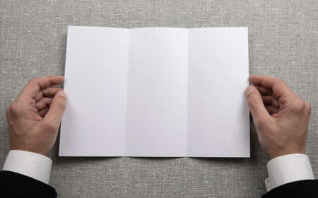 Old photo in the hands of man. Empty template for picture, mock-up. Gray background.