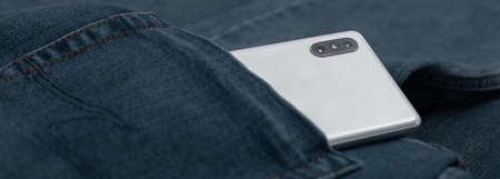 Top view of front and back of smartphone and stationery on dark modern office desk