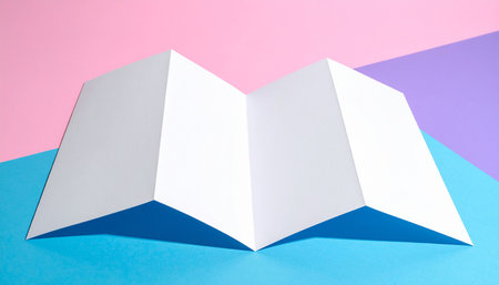 A white paper folded in a zigzag pattern lies on a blue and pink background, with distinct shadows cast by light.