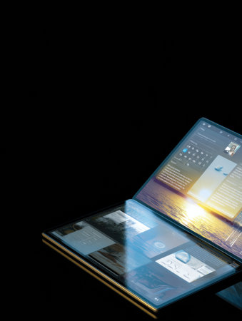 A sleek laptop is open and brightly displaying a sunset landscape, highlighting the blend of technology and creativity against a dark backdrop.