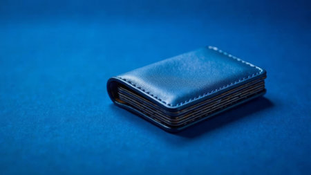 Elegant blue leather wallet with detailed stitching placed on a textured blue background. Compact and stylish accessory, sophistication and luxury, perfect for finance and lifestyle themes. No lable