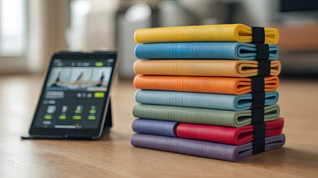 A stack of vibrant exercise mats rests next to a tablet showing a fitness app in a modern home setting, inspiring motivation for workout routines.