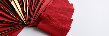 Rows of vibrant red envelopes placed neatly in a fan-like arrangement, with golden accents shining brightly on a white background