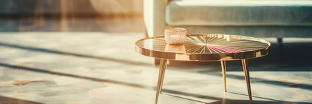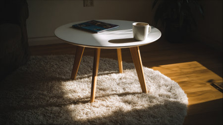 A peaceful living room scene featuring a round table with a coffee cup and a magazine on top, bathed in warm sunlight and soft shadows on a plush rug.