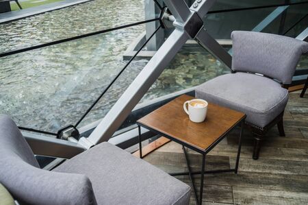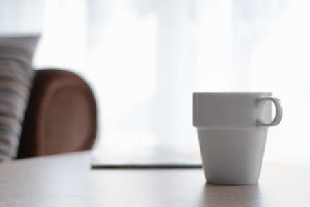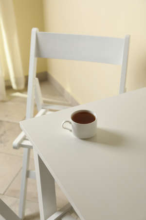 a mug of hot tea on the table on the balcony. breakfast by the window. a hot delicious drink. background for the design.