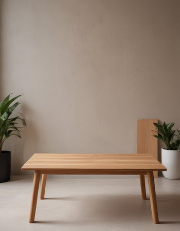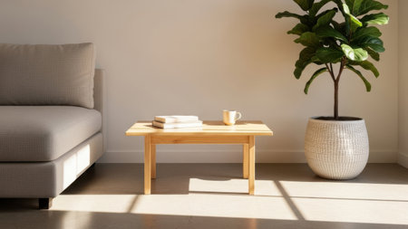 Sunlight filters through large windows, illuminating a minimalist living room with a stylish wooden coffee table. A decorative plant sits atop the table, complementing the calming decor and inviting ambiance.