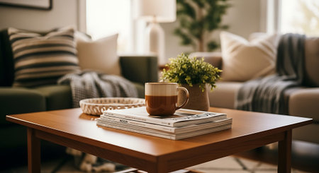A warm living room scene featuring a wooden coffee table with a mug of coffee, stack of magazines, and a small potted plant. Comfortable couches and decorative pillows in the background.