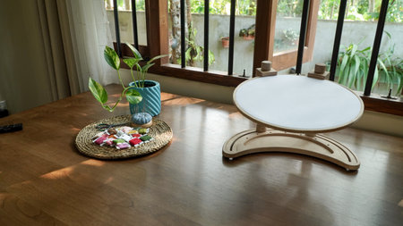 A round wooden table with leaf patterns, with coffee and tea on it, is placed in the center of an indoor living room. The leaves and wood grain texture contrast each other, creating beautiful shadows under sunlight. It has a high resolution and a top-down perspective, with green plants adding vitality to the scene. High definition photography style, in the style of Jean Nouvel. --ar 3:2 --v 6.1 Job ID: 73fc51e0-f07a-4d4d-bb6b-b7502943fa33