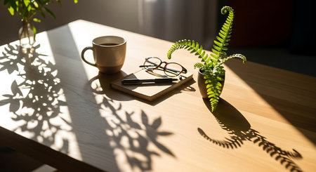 A cozy scene of a ceramic coffee cup on a rustic wooden table, bathed in warm sunlight with soft natural shadows.