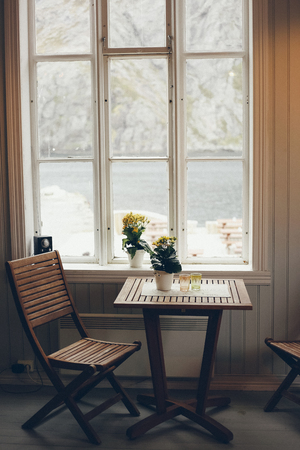 outdoor table and two chairs near the wall at coffee shop, Bergen, Norway
