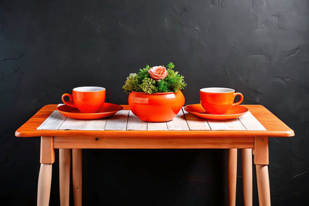 A serene and minimalist setup featuring a wooden table and two white chairs, complemented by coffee cups, perfect for modern home d