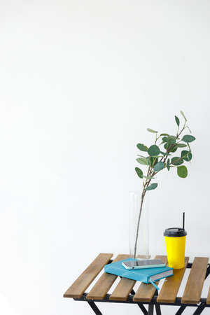 Wooden table against background of white wall. Vase with eucalyptus branch, yellow paper coffee cup and smartphone with notepad. Freelancer workplace