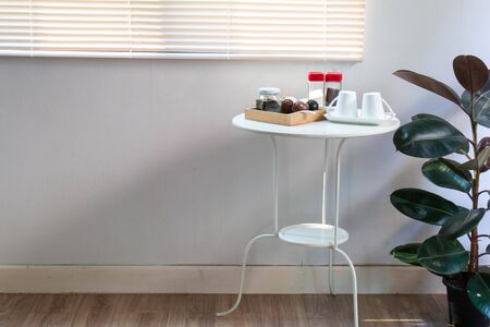 small wooden table at home, modern compact kitchen table. green plant, a cup of coffee and eyeglasses on table