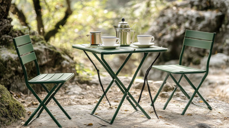 Minimalist folding table on a forest campsite, compact and streamlined, ideal for a modern, outdoor lifestyle.