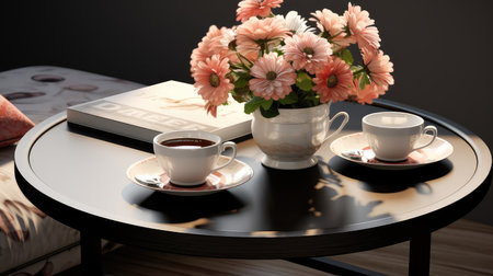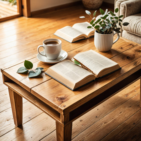 A serene living room setting with a wooden table featuring a cup of coffee, a stack of books, and a potted plant, surrounded by comfortable furniture and soft lighting.