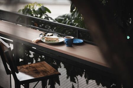 Abstract scene of breakfast meal set including tuna sandwich, hot long black coffee, and brownie cheese cake on outdoor wood bar.