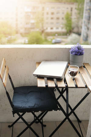 Cozy working place outside. Morning routine at the balcony. Home education.