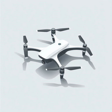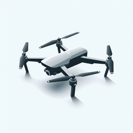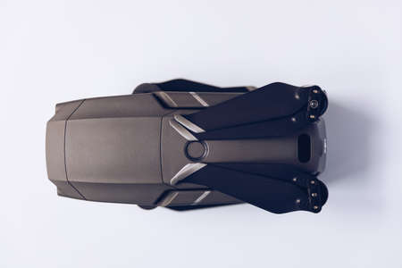 New modern drone on display on white background. Drone quadcopter with digital camera.