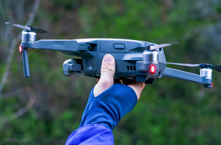Quadcopter drone on operator hand. Small drone land on hand after taking video and photos. Remote control air delivery and spy.