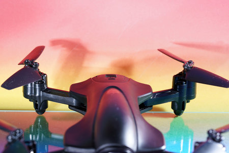A flying drone. Airborne quadcopter. Also known as a drone or UAV, Unmanned Aerial Vehicle. Drone with camera on a colorful background with copy space.