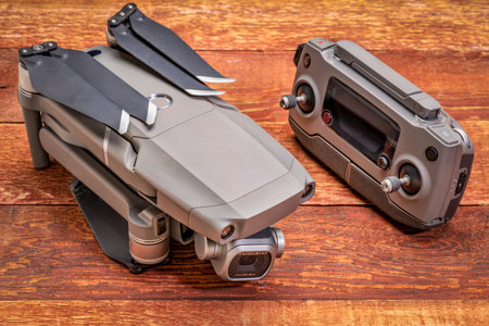 Fort Collins, CO, USA - January 18, 2019: DJI Mavic 2 pro with Hasselblad camera and radio controller against rustic wood - an advanced prosumer folding drone.