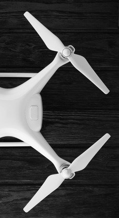 The remote control quadcopter white color.flight controller on an old wooden background. The view from the top