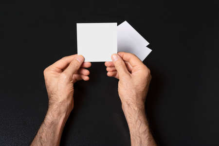 Mens hand holding empty black flyers on blue wooden background. Blank paper mock-up