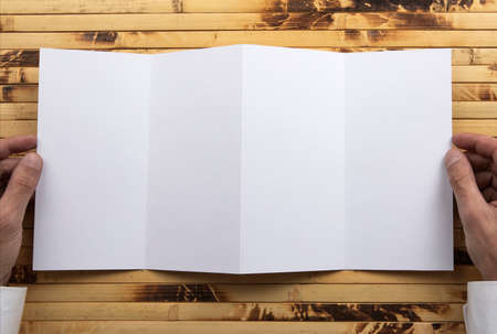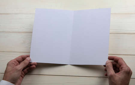 male hands holding a white blank sheet of paper on the background of wooden texture table