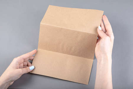 Holding empty paper in the hands, gray colored background, copy space for text, blank card