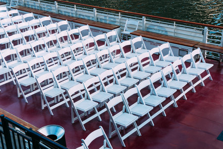 An overhead shot captures rows of white folding chairs neatly arranged on a boat deck, likely for an outdoor event or ceremony. The chairs are set against a backdrop of water and boat details.