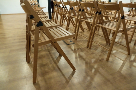 Folding chairs made from steel and wood standing in collapsed in multiple rows.