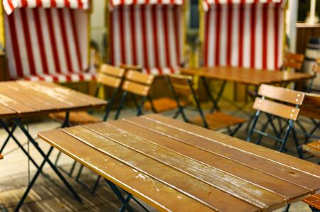 Scene of empty wooden tables and chairs of a restaurant outside after the rain and without guests in Germany