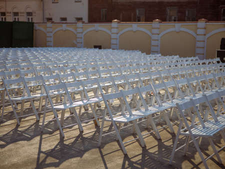 White chairs on the roof. Concert hall. Many white wooden chairs. Background of white wooden chairs