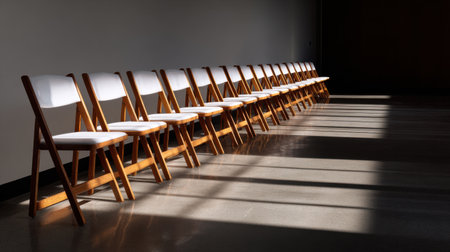 A row of wooden chairs are lined up in a room. The chairs are all facing the same direction, and the room is mostly empty. The chairs are arranged in a way that creates a sense of order