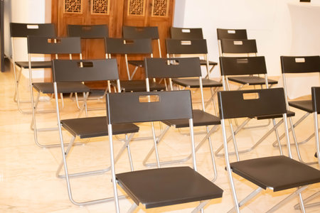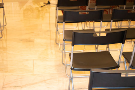 Rows of empty black chairs, prepared for event. Pordenone, Italy