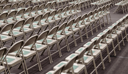 Foldable chairs arranged for a press event, all unoccupied and evenly spaced in a plain setting